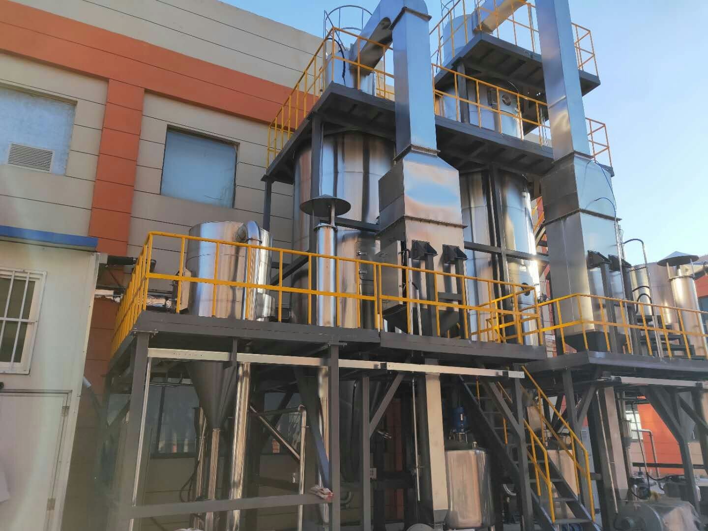 壓力噴霧干燥機(jī)工作過程為:料液通過隔膜泵高壓輸入,噴出霧狀液滴,然后同熱空氣并流下降,大部分粉粒由塔底排料口收集,廢氣及其微小粉末經(jīng)旋風(fēng)分離器分離,廢氣由抽風(fēng)機(jī)排出,粉末由設(shè)在旋風(fēng)分離器下的收粉筒收集,風(fēng)機(jī)出口處還可裝備二級(jí)除塵裝置,回收率在96%-98%。
