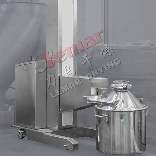 該機主要由底盤、立柱、提升系統(tǒng)等部件組成。工作時,先將裝有物料的料斗推入料斗提升機的提升叉架上,然后啟動提升按鈕,料斗做提升運動,料斗到位后轉動底盤與加料的設備密閉對接,開啟出料蝶閥,使物料密閉轉移到下一工序。