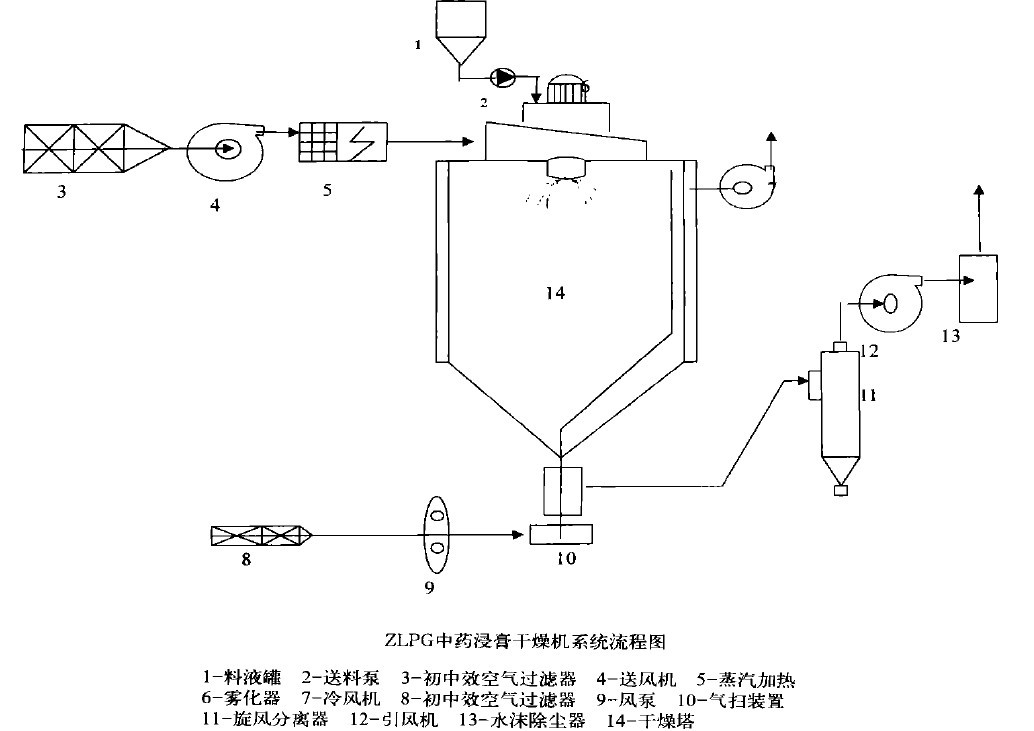 通過對ZLPG噴霧干燥機的原理、工藝流程的介紹,闡述了它是適應于多糖、高蛋白、高含糖量、軟化點低及吸濕性強的中藥浸膏的干燥。實踐證明,它是目前中藥提取浸膏干燥技術中值得推廣應用的技術,通過它的干燥,保證了干燥后的中藥有效成分不焦化、不變質、無污染,生產(chǎn)過程符合GMP 的要求。