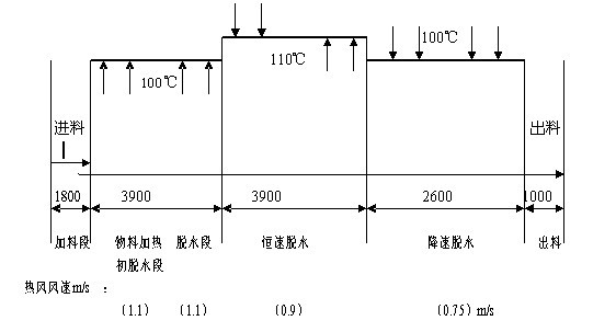 如圖所示,椰蓉由擺動式布料機(jī)自動均勻進(jìn)入加料段,由下向上鼓進(jìn)經(jīng)100℃熱風(fēng),其主要作用是椰蓉比較均勻吸熱起到初脫水效果,逐漸進(jìn)入脫水階段,椰蓉進(jìn)入熱風(fēng)溫度110℃干燥段改變風(fēng)向由上向下進(jìn)110℃熱風(fēng),椰蓉在該區(qū)間應(yīng)是物料的恒速脫水段,椰蓉的水分主要是在上述兩個區(qū)間脫除的,已脫除約80%水分的椰蓉再輸送至熱風(fēng)溫度為100℃的再干燥區(qū)間,該區(qū)間100℃熱風(fēng)由上向下穿過已較干燥的椰蓉層,其主要作用是慢速脫除物料內(nèi)部遷移出來的水分。經(jīng)過以上主要干燥段脫水后,椰蓉的含水率可控制在≤3%的范圍。已達(dá)標(biāo)的椰蓉出料進(jìn)入下一道加工工序。為使熱風(fēng)分風(fēng)更均勻,設(shè)備設(shè)計成8個單元,內(nèi)部設(shè)有特殊的分風(fēng)裝置,并對每個單元的溫度進(jìn)行自動控制。