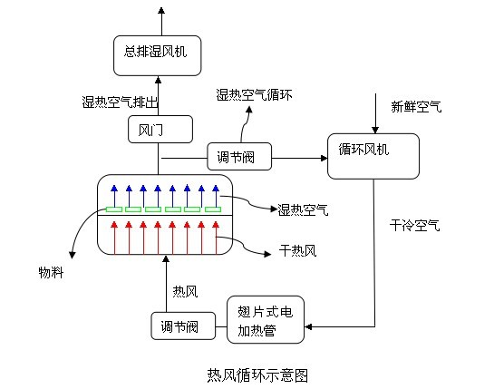 熱風(fēng)循環(huán)風(fēng)機在吸入新鮮空氣的同時,吸入一部分從干燥室出來的濕熱空氣,以充分利用熱能??諝饨?jīng)過翅片式電加熱管后被加熱,送入干燥室由下往上吹送對物料進行烘干,如圖所示。
